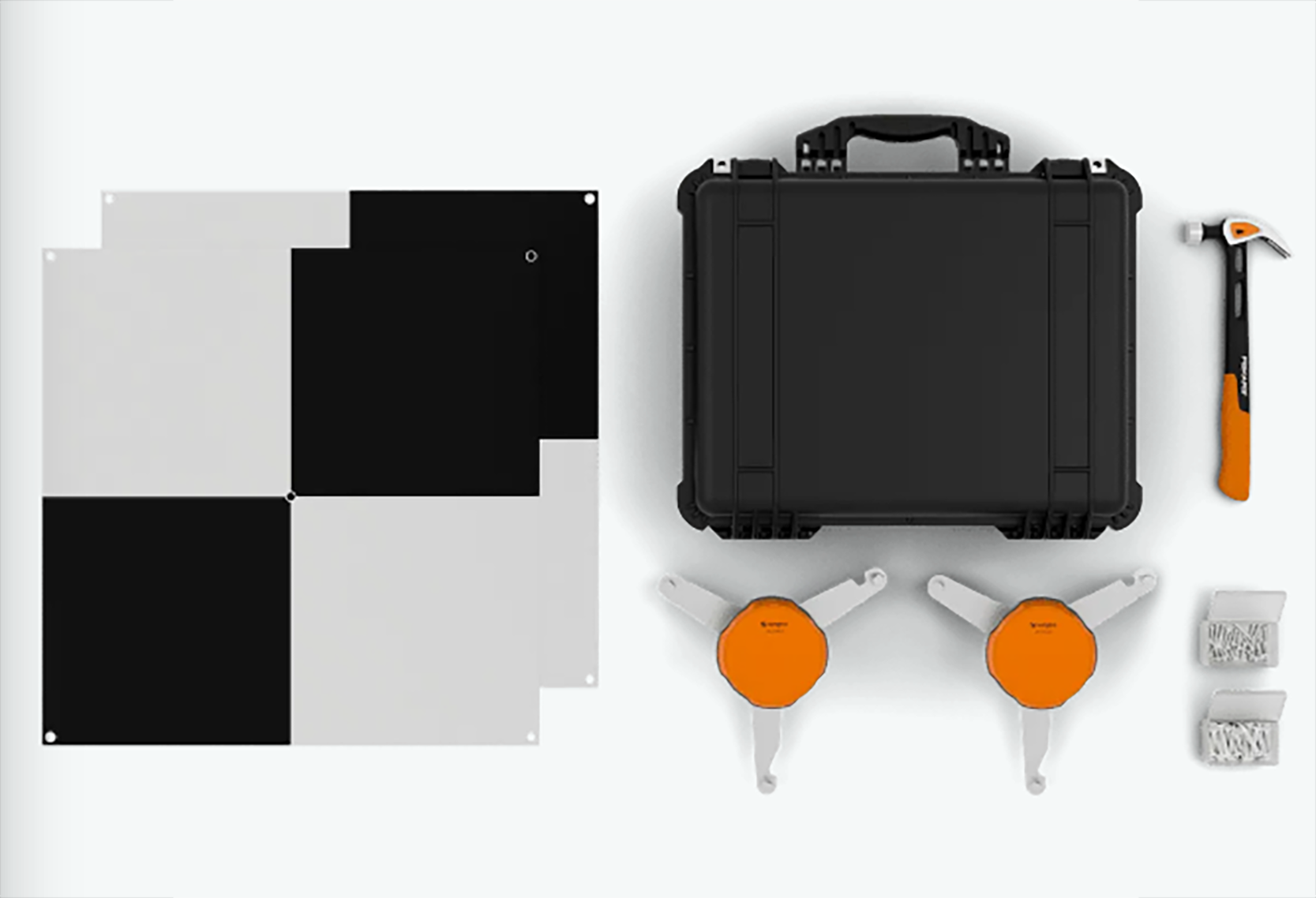 Dedykowany do drona WingtraOne zestaw zawiera wszystko, czego potrzebujesz do pomiarów — odbiorniki GNSS, statywy, punkty kontrolne, gwoździe i młotek — w jednej, przenośnej, twardej torbie.